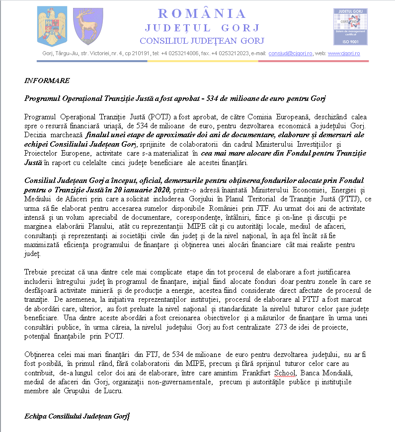 Programul Operațional Tranziție Justă (POTJ) a fost aprobat, de către Comisia Europeană, deschizând calea spre o resursă financiară uriașă, de 534 de milioane de euro, pentru dezvoltarea economică a județului Gorj, se arată într-unul din comunicatele Consiliilui Județean Gorj. Decizia marchează finalul unei etape de aproximativ doi ani de documentare, elaborare și demersuri ale echipei Consiliului Județean Gorj, sprijinite de colaboratorii din cadrul Ministerului Investițiilor și Proiectelor Europene, activitate care s-a materializat în cea mai mare alocare din Fondul pentru Tranziție Justă în raport cu celelalte cinci județe beneficiare ale acestei finanțări. Consiliul Județean Gorj a început, oficial, demersurile pentru obținerea fondurilor alocate prin Fondul pentru o Tranziție Justă în 20 ianuarie 2020. Au urmat doi ani de activitate intensă și un volum apreciabil de documentare, corespondențe, întâlniri, fizice și on-line și discuții pe marginea elaborării Planului, în așa fel încât să fie maximizată eficiența programului de finanțare și obținerea unei alocări financiare cât mai realiste pentru județ.