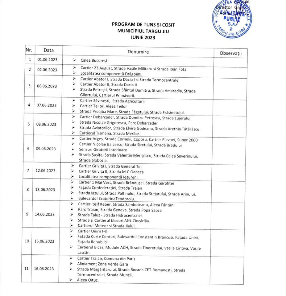 Societatea Edilitara amintește cetățenilor că realizarea cositului în Municipiul Târgu Jiu se va realiza conform graficului anunțat. Salariații Edilitara vor ajunge în fiecare zonă în parte. De asemenea, cetățenii sunt rugați, pentru a facilita munca personalului din teren, să elibereze de mașini zonele în proximitatea cărora urmează să se desfășoare cositul, pentru a evita eventuale avarii produse involuntar autovehiculelor.