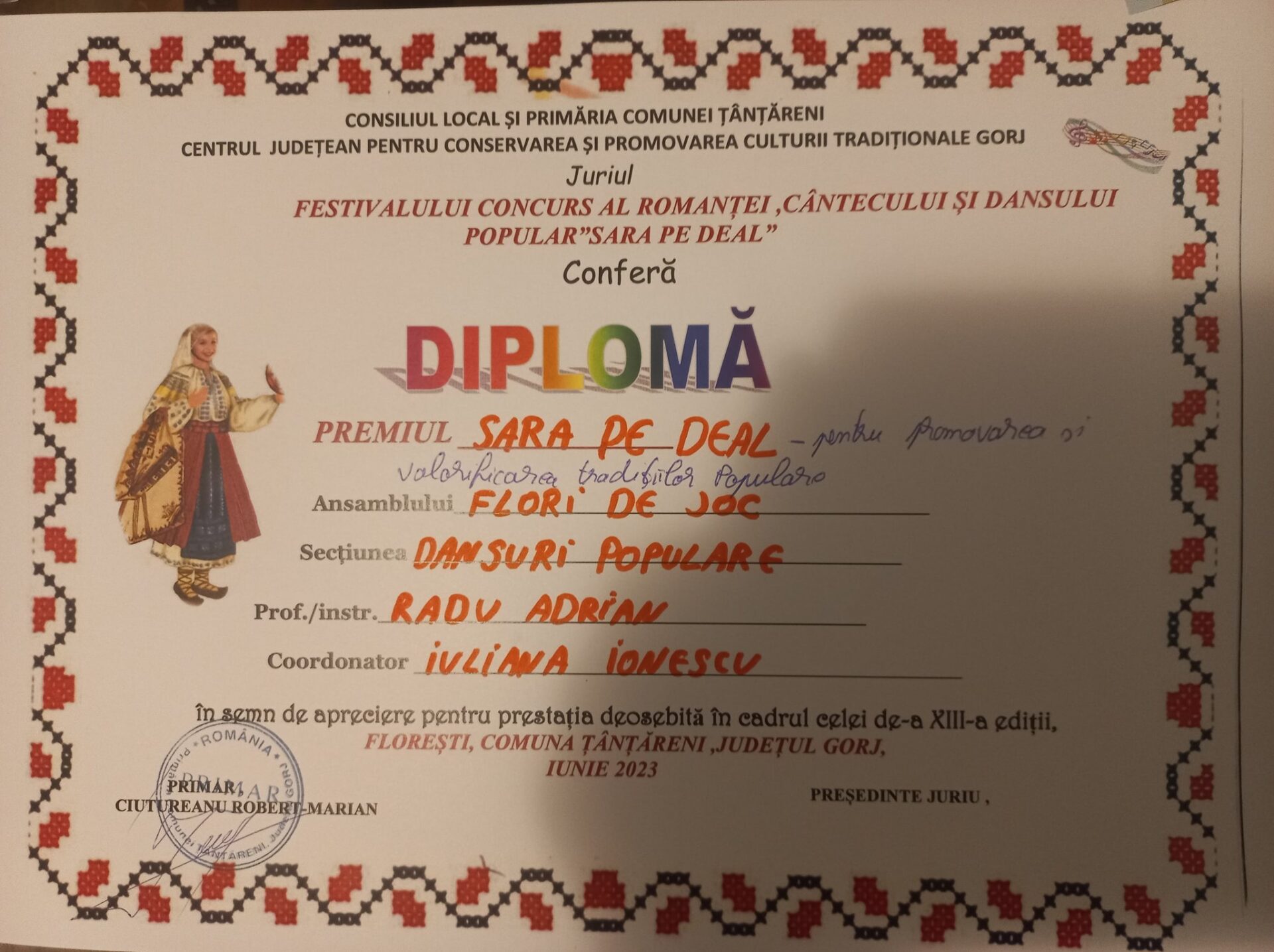 Ansamblul Folcloric “Flori de Joc” al Căminului Cultural Țânțăreni a câștigat premiul pentru valorificarea și promovarea tradițiilor populare, premiu acordat pentru prima dată, anul acesta în cadrul Festivalului de Romanțe “Sara pe Deal”, desfășurat duminică 25 iunie 2023 la Țânțăreni.