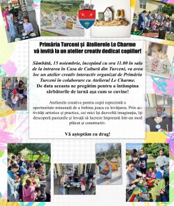 Primăria Turceni și Atelierele Le Charme organizează un atelier creativ pentru copii. Evenimentul va avea loc, sâmbătă, 15 noiembrie, începând cu ora 11.00, în sala de la intrarea în Casa de Cultură Turceni.
