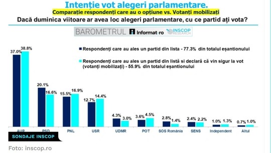 38.8% dintre cei care au exprimat o opţiune de vot ar vota cu AUR, 16.9% cu PNL, 16.6% cu PSD, 14.4% cu USR. Pentru UDMR ar opta 3% dintre alegători, pentru POT – 4.5%, pentru SOS România – 1.4%, iar pentru SENS – 2.2%. 1.3% dintre respondenţi îşi exprimă preferinţa pentru un candidat independent, iar 1% pentru alt partid.