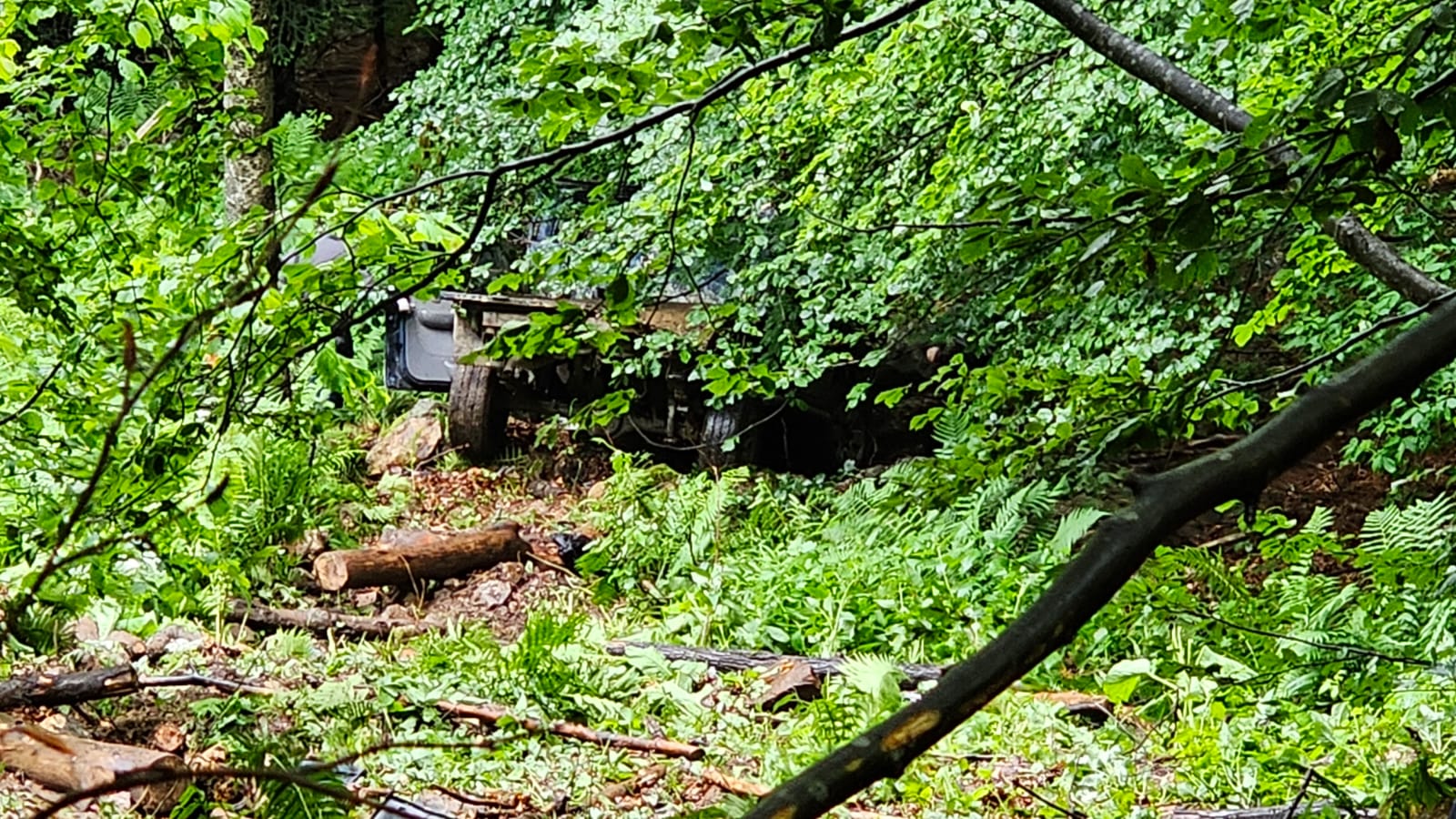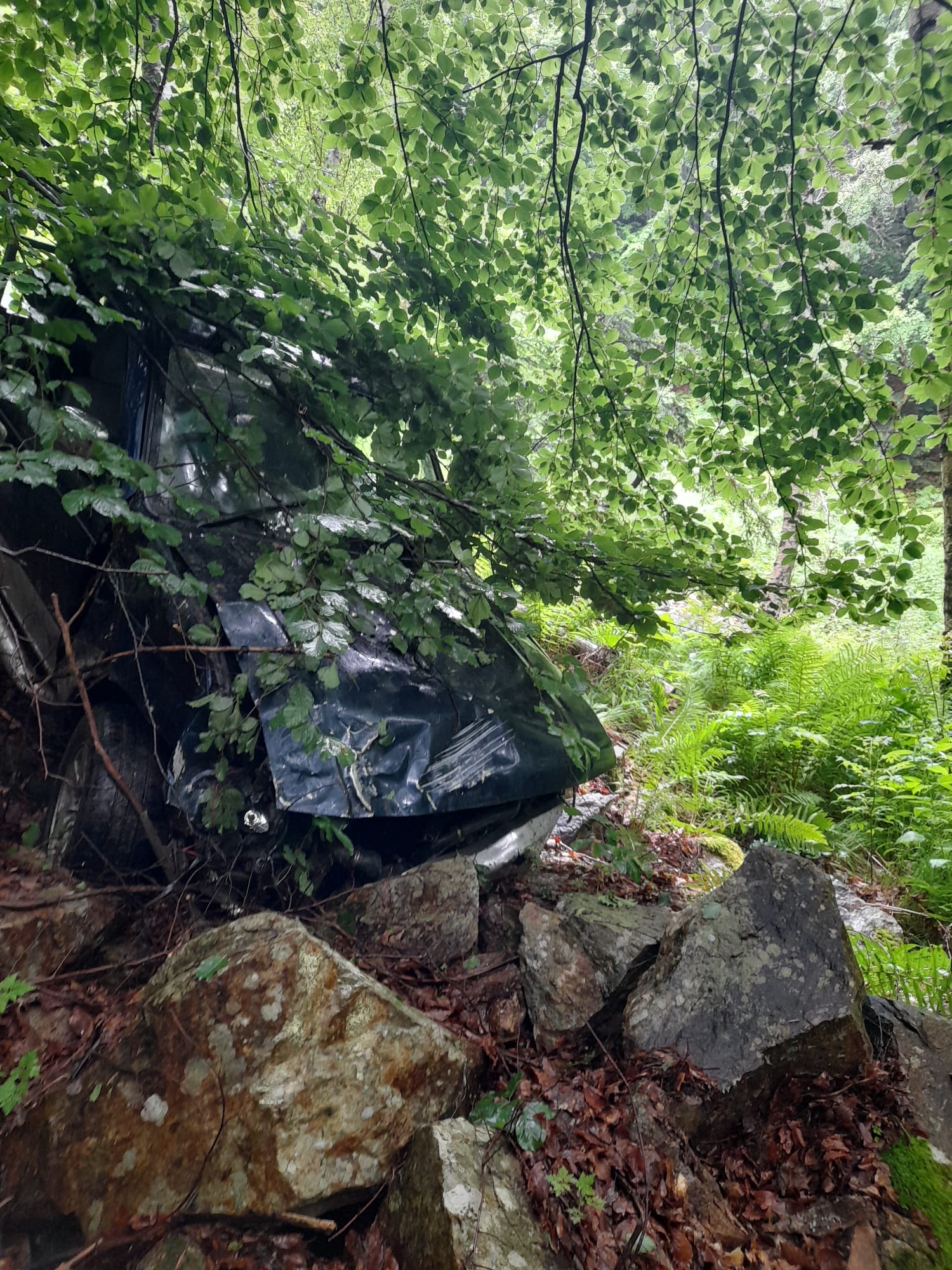 “Acțiune în derulare a salvamontistilor din cadrul serviciului Salvamont al Consiliului Județean Gorj pentru recuperarea unei persoane prabusita cu mașina intr-o prăpastie in valea Galbenului, masivul Parang.