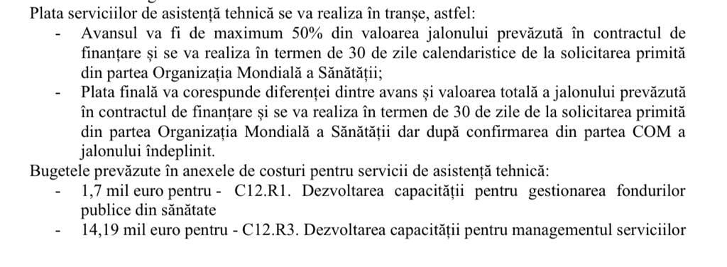 Banii către OMS pe consultanță urmează să fie plătiți în următoarele tranșe: