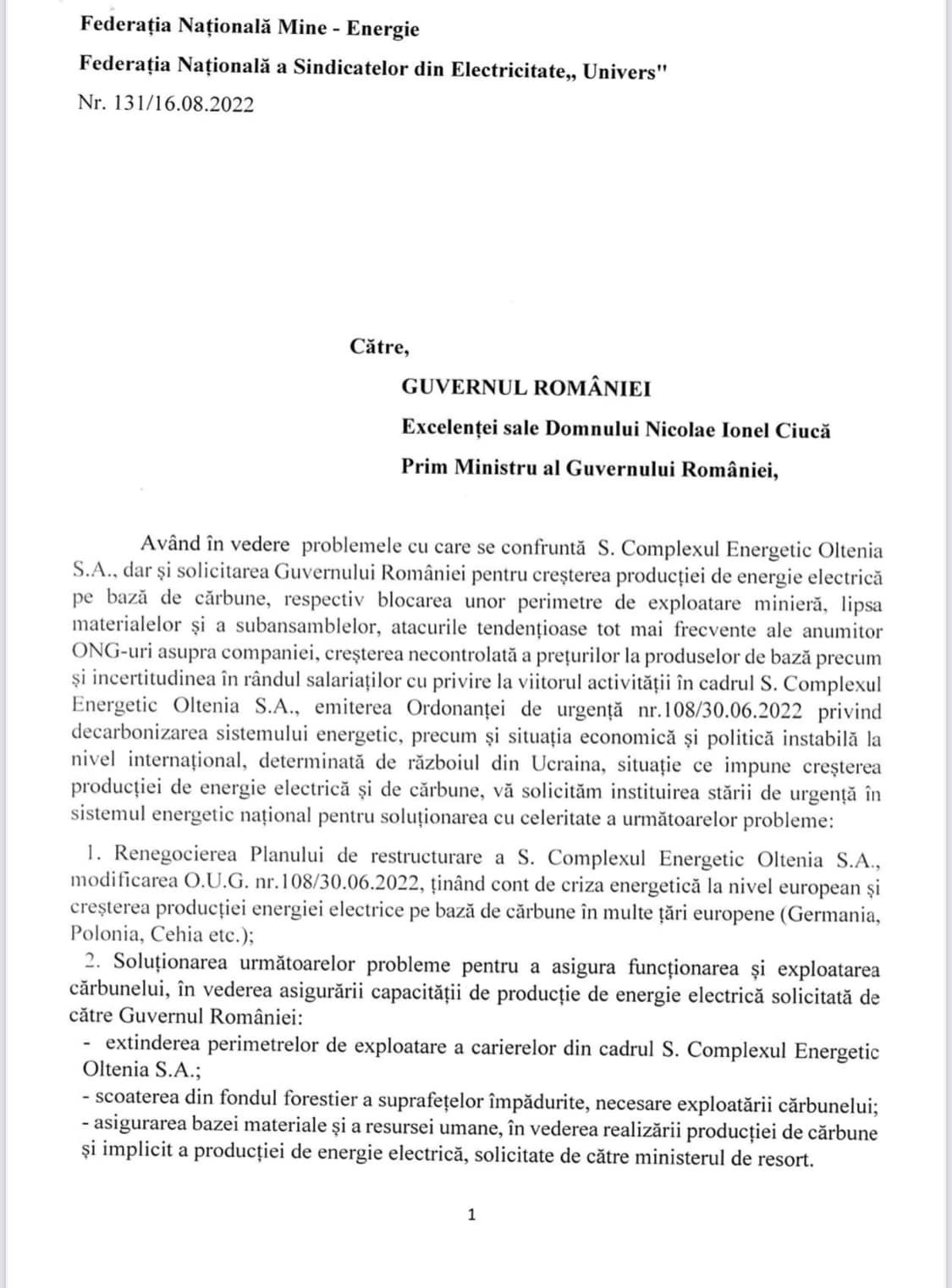 “Având în vedere problemele cu care se confruntă S. Complexul Energetic Oltenia S.A., dar și solicitarea Guvernului României pentru creșterea producției de energie electrică pe bază de cărbune, respectiv blocarea unor perimetre de exploatare minieră, lipsa materialelor și a subansamblelor, atacurile tendențioase tot mai frecvente ale anumitor ONG-uri asupra companiei, creșterea necontrolată a prețurilor la produselor de bază precum și incertitudinea în rândul salariaților cu privire la viitorul activității în cadrul S. Complexul Energetic Oltenia S.A., emiterea Ordonanței de urgență nr.108/30.06.2022 privind decarbonizarea sistemului energetic, precum și situația economică și politică instabilă la nivel internațional, determinată de războiul din Ucraina, situație ce impune creșterea producției de energie electrică și de cărbune, vă solicităm instituirea stării de urgență în sistemul energetic național pentru soluționarea cu celeritate a următoarelor probleme: