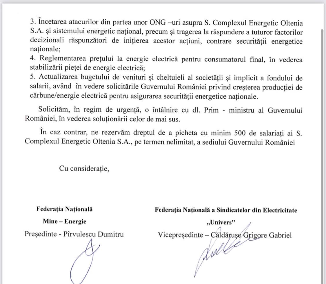 În caz contrar, ne rezervăm dreptul de a picheta cu minim 500 de salariați ai S. Complexul Energetic Oltenia S.A., pe termen nelimitat, a sediului Guvernului României”