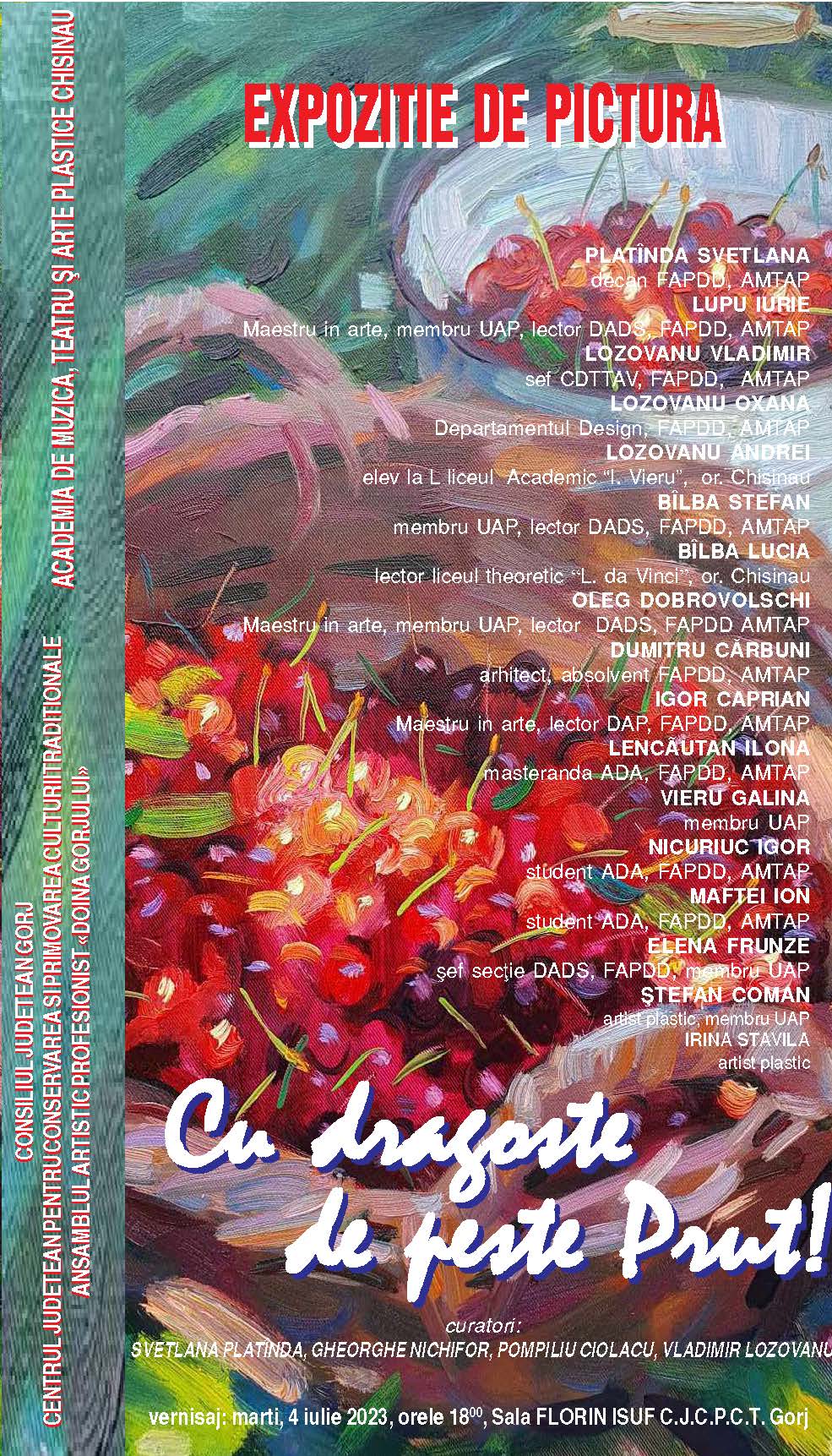 Consiliul Județean Gorj, Centrul Județean pentru Conservarea și Promovarea Culturii Tradiționale Gorj, Ansamblul Artistic Profesionist “Doina Gorjului” și Academia de Muzică, Teatru și Arte Plastice Chișinău organizează expoziția de pictură “Cu dragoste de peste Prut” marți, 4 iulie 2023, la sala “Florin Isuf” începând cu ora 18:00.