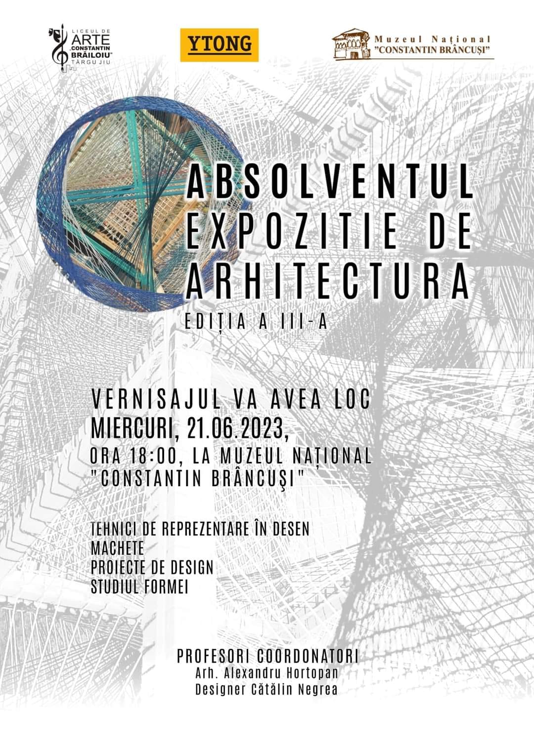 Miercuri, 21 iunie, începând cu ora 18:00, în sala de la demisol a Muzeului Național „Constantin Brâncuși” Târgu Jiu, va avea loc expoziția de arhitectură „Absolventul” a elevilor de la Liceul de Arte „Constantin Brăiloiu” Târgu Jiu! Coordonatorii proiectului sunt arhitectul Alexandru Hortopan și artistul plastic Cata Negrea.