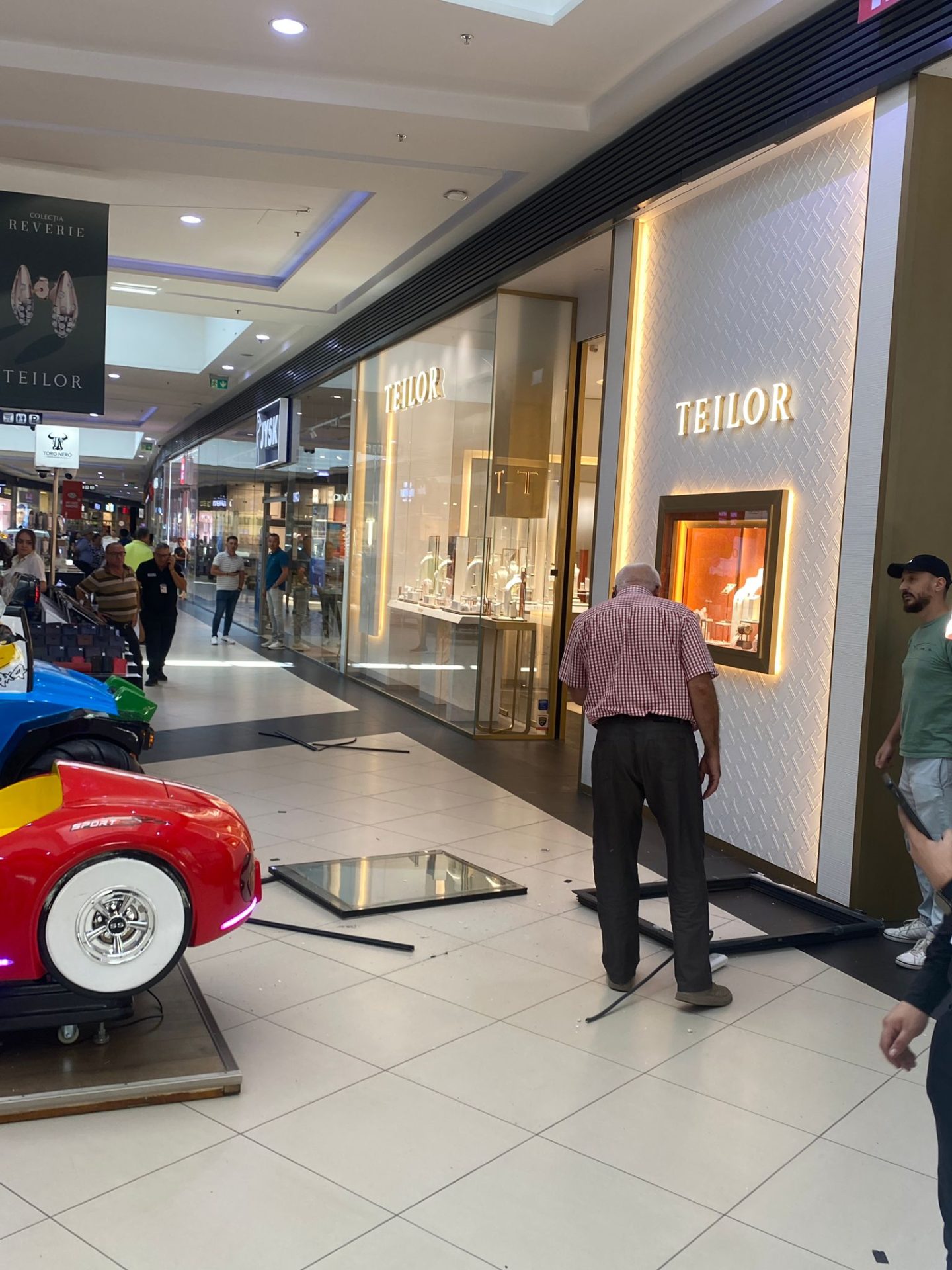 Bucata de sticlă, încadrată în metal, a căzut de la înălțime și s-a spart în mai multe bucăți, împrăștiindu-se pe podeaua intens circulată. Din fericire, nimeni nu a fost rănit, însă pericolul a fost real. În imagini surprinse la scurt timp după incident se poate vedea cât de aproape a fost prăbușirea de un carusel pentru copii, dar și de trecători.