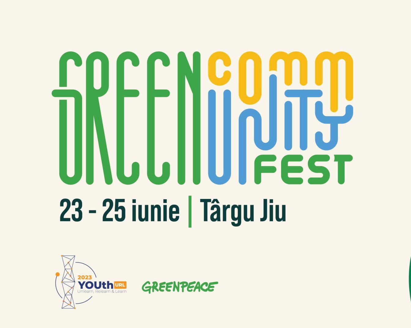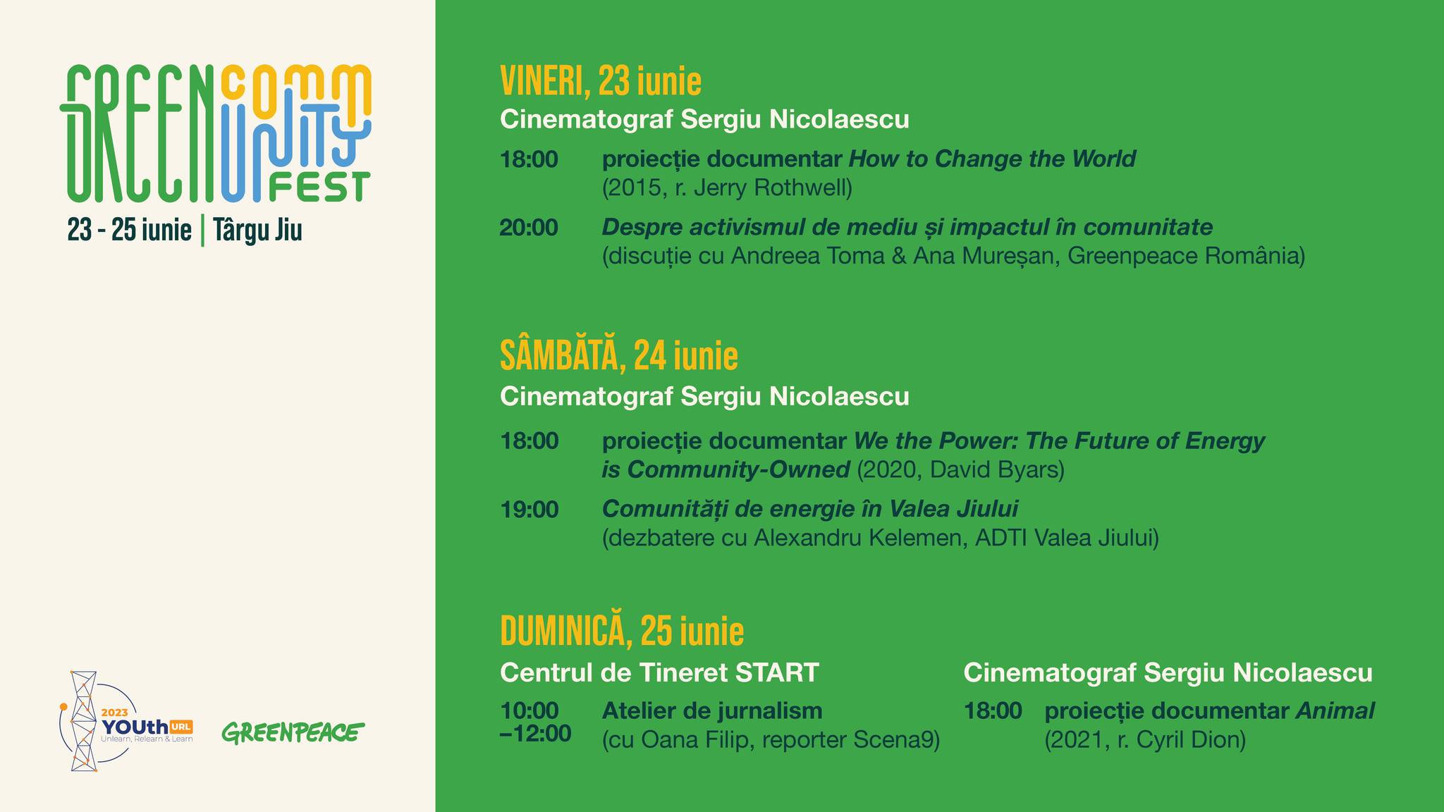 Târgu Jiu, 20 iunie 2023 – Greenpeace România și Asociația Colour Your Dreams organizează o serie de proiecții de film și dezbateri pe subiecte de mediu și activism, în cadrul Green CommUNITY Fest, care are loc în perioada 23-25 iunie și include ateliere și activități destinate tinerilor din Târgu Jiu.