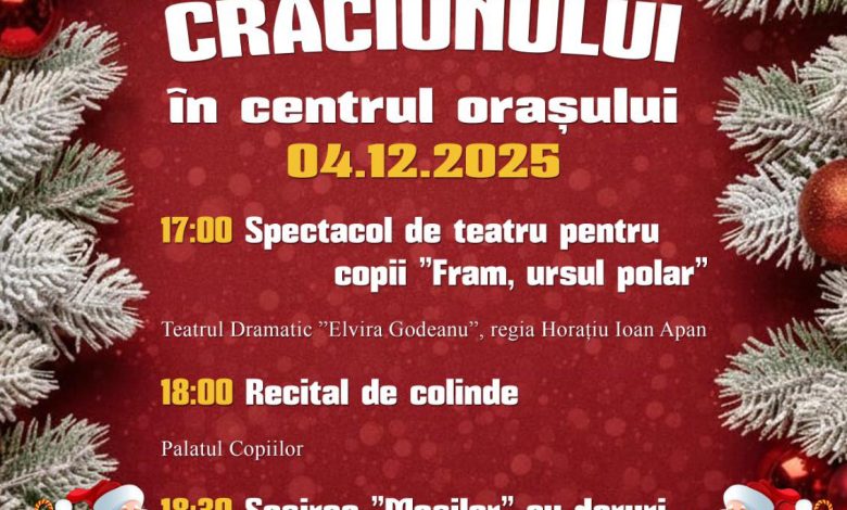 Programul începe la ora 17:00 cu spectacolul „Fram, ursul polar”, urmat de un recital de colinde susținut de elevii talentați ai Palatului Copiilor.