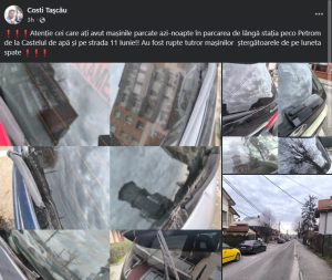 Potrivit mesajului distribuit online, autoturismele parcate în zona stației Petrom de la Castelul de Apă, dar și pe strada 11 Iunie, din Târgu Jiu, au fost vandalizate în cursul nopții.