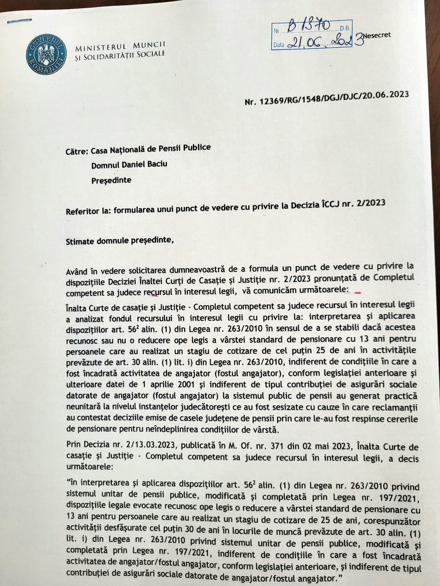 În acelaşi sens şi-a exprimat punctul de vedere si Minsiterul Muncii şi Protecției Sociale, prin adresa nr. 12369/RG/1548/DGJ/DJC/20.06.2023, pe care îl atașăm prezentei.”