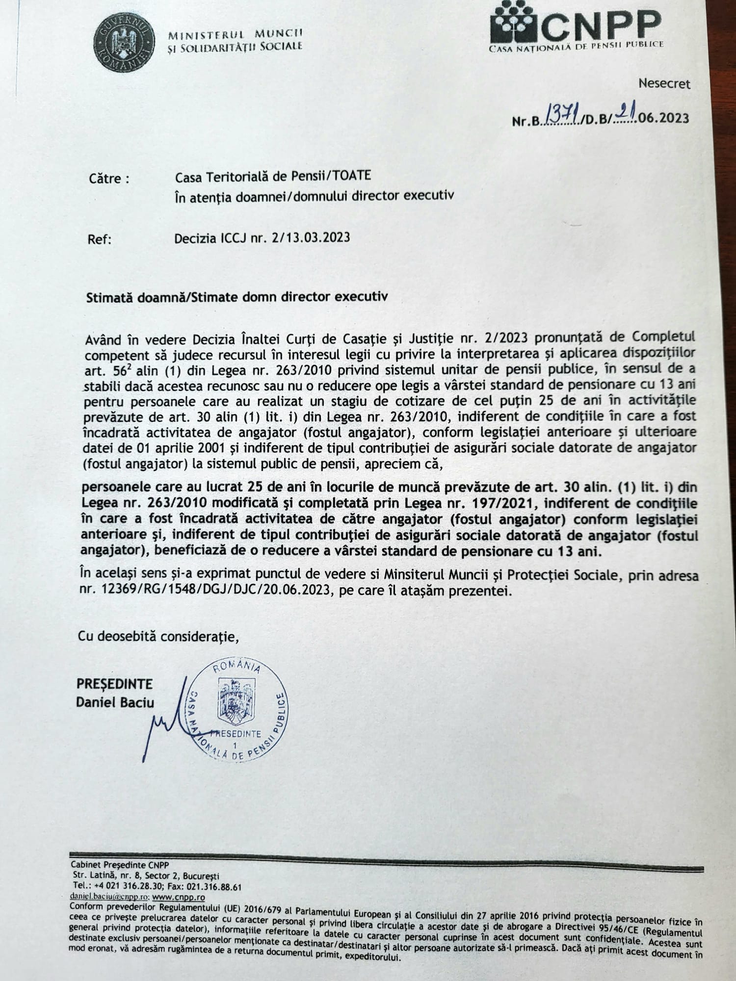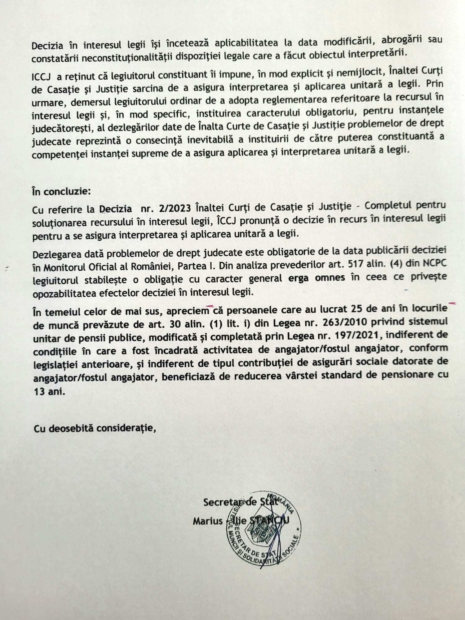 Având în vedere Decizia Înaltei Curți de Casaţie şi Justiţie nr. 2/2023 pronunţată de Completul competent să judece recursul în interesul legii cu privire la interpretarea şi aplicarea dispoziţiilor art. 562 alin (1) din Legea nr. 263/2010 privind sistemul unitar de pensii publice, în sensul de a stabili dacă acestea recunosc sau nu o reducere ope legis a vârstei standard de pensionare cu 13 ani pentru persoanele care au realizat un stagiu de cotizare de cel puţin 25 de ani în activităţile prevăzute de art. 30 alin (1) lit. i) din Legea nr. 263/2010, indiferent de condiţiile în care a fost încadrată activitatea de angajator (fostul angajator), conform legislaţiei anterioare şi ulterioare datei de 01 aprilie 2001 şi indiferent de tipul contribuţiei de asigurări sociale datorate de angajator (fostul angajator) la sistemul public de pensii, apreciem că, persoanele care au lucrat 25 de ani în locurile de muncă prevăzute de art. 30 alin. (1) lit. i) din Legea nr. 263/2010 modificată şi completată prin Legea nr. 197/2021, indiferent de condiţiile în care a fost încadrată activitatea de către angajator (fostul angajator) conform legislaţiei anterioare şi, indiferent de tipul contribuţiei de asigurări sociale datorată de angajator (fostul angajator), beneficiază de o reducere a vârstei standard de pensionare cu 13 ani.