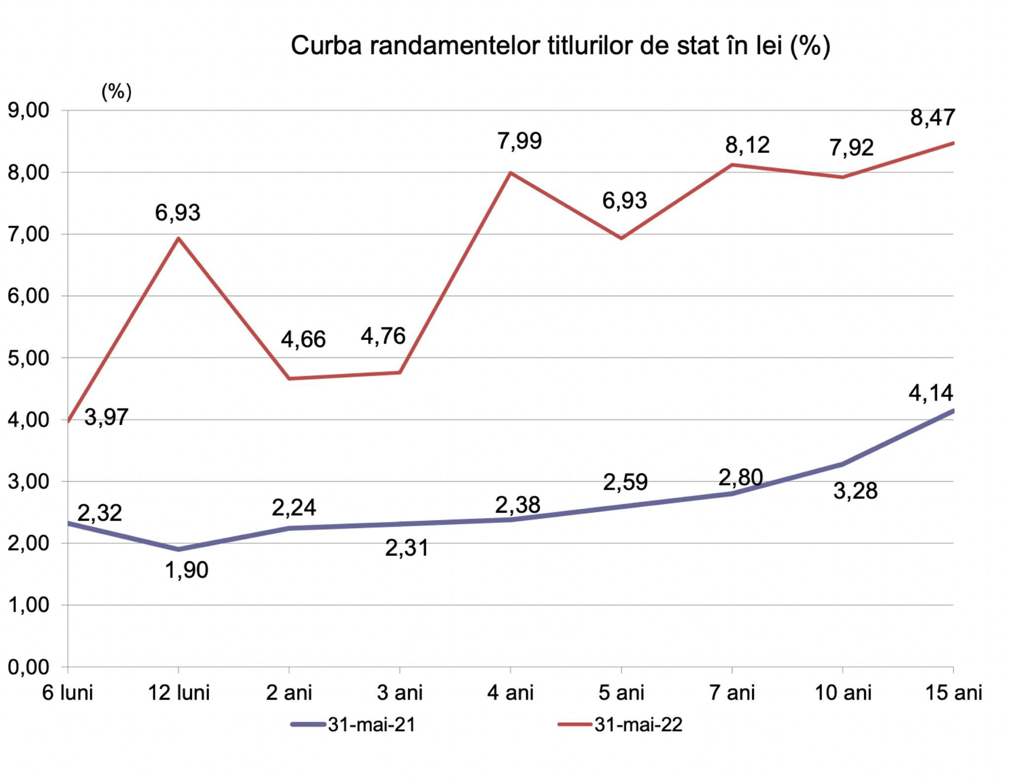 În 2022 România se împrumută la dobânzi mai mari decât în 2020 și 2021. Mult mai mari. La 6 luni, 3.97% în 2022 > 2.32% în 2021. Iar la 15 ani, 8.47% în 2022 > 4.14% în 2021.