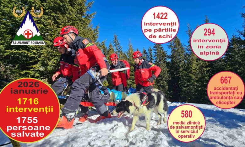 Lună de foc pentru salvamontiști! În ianuarie 2026, salvamontiștii din toată țara au avut nu mai puțin de 1.716 intervenții, în urma cărora 1.755 de persoane au fost salvate. Cele mai multe incidente s-au produs pe pârtiile de schi, unde echipele au intervenit de 1.422 de ori, în timp ce 294 de acțiuni au avut loc în zona alpină, în condiții extreme.