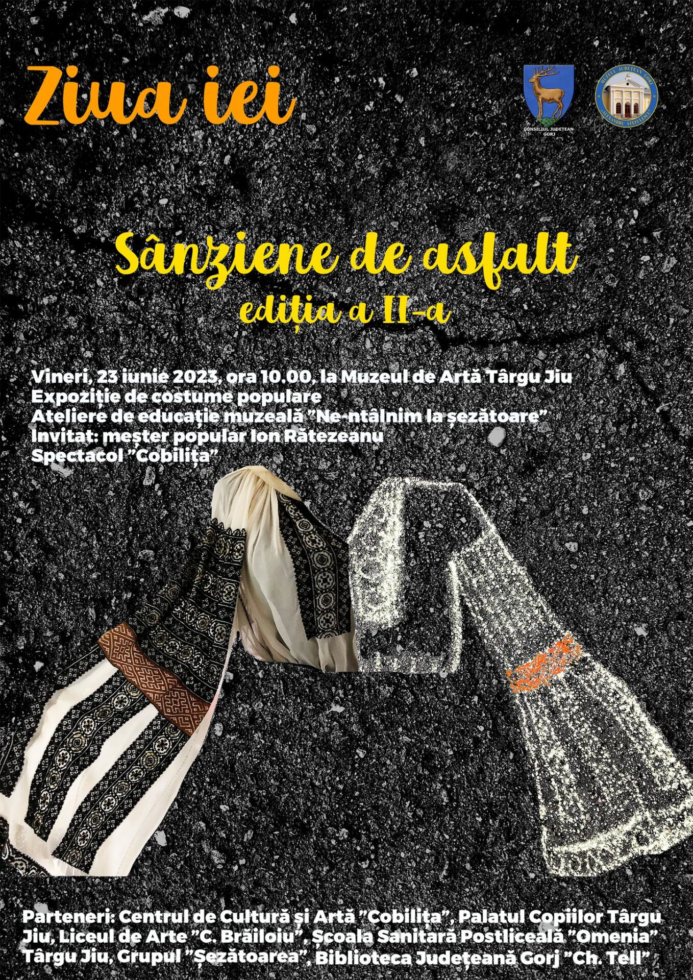 Vineri, 23 iunie 2023, de la ora 10.00, în curtea Muzeului de Artă Târgu Jiu va avea loc întâlnirea ”Sânziene de asfalt”, ediția a doua, un eveniment ce (re)aduce și vrea să păstreze în zona urbană ia românească și tradițiile. Expoziția de costume tradiționale vechi și cu povești fascinante, atelierele pentru copii și adulți, muzica, demonstrațiile de cusături, mărgelit și ceramică tradițională, dansul și, nu în ultimul rând, coronițele din sânziene transformă curtea muzeului, timp de două ore, într-o mare șezătoare urbană. Partenerii Consiliului Județean Gorj și ai Muzeului Județean Gorj ”Alexandru Ștefulescu” sunt Centrul pentru Cultură și Artă ”Cobilița”, Biblioteca Județeană Gorj ”Christian Tell”, Palatul Copiilor Târgu Jiu, Liceul de Arte ”Constantin Brăiloiu”, Grupul ”Șezătoarea” și Școala Sanitară Postliceală ”Omenia” Târgu Jiu.