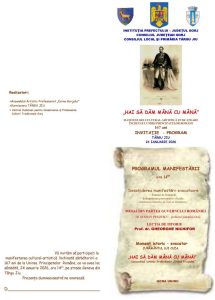 Sâmbătă, 24 ianuarie, de la ora 14:00, pe strada Geneva din Târgu Jiu, are loc manifestarea cultural-evocatoare „Hai să dăm mână cu mână”, dedicată împlinirii a 167 de ani de la Unirea Principatelor Române. Programul cuprinde momente istorice, alocuțiuni oficiale, lecții de istorie și un spectacol artistic susținut de Ansamblul Artistic Profesionist „Doina Gorjului”, încheiat cu Hora Unirii.
