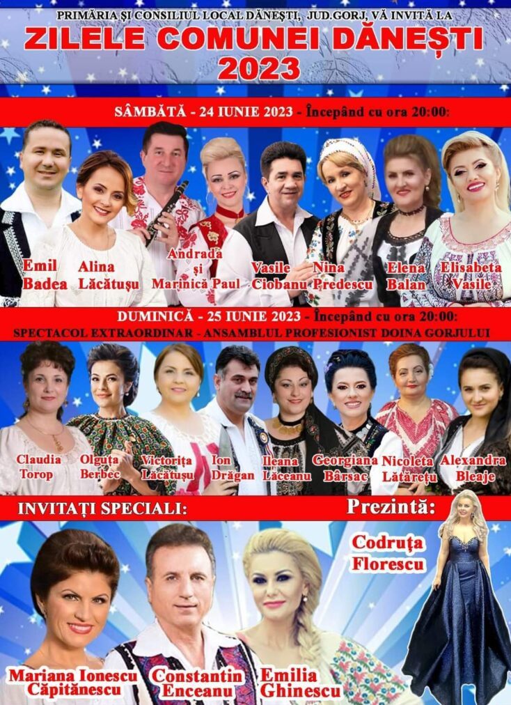 Artiștii care vor concert ape scena din Dănești sunt Emil Badea, Alina Lăcătușu, Andrada și Marinică Paul, Vasile Ciobanu, Nina Predescu, Elena Bălan, Elisabeta Vasile, Claudia Torop, Olguța Berbec, Victorița Lăcătușu, Ion Drăgan, Ileana Lăceanu, Georgiana Bârsac, Nicoleta Lătărețu, Alexandra Bleaje.