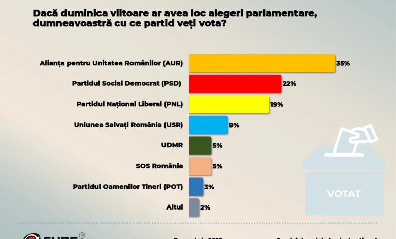În scenariul organizării alegerilor duminica viitoare, Alianța pentru Unitatea Românilor (AUR) ar obține 35% din sufragii, în creștere ușoară față de 34% în sondajul precedent din septembrie. Această evoluție consolidează poziția AUR ca principal beneficiar al nemulțumirii sociale.