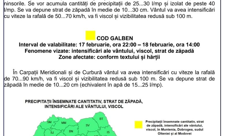 INFORMARE METEOROLOGICĂ – COD GALBEN 17 februarie, ora 10:00 – 18 februarie, ora 14:00 ANM a emis o informare meteorologică…