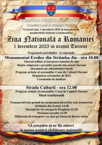 Ziua Națională a României va fi marcată și la Turceni printr-o serie de manifestări organizate de primărie și Consiliul Local. Programul va începe la ora 10.00, la Monumentul Eroilor din Strâmba-Jiu, unde sunt programate: